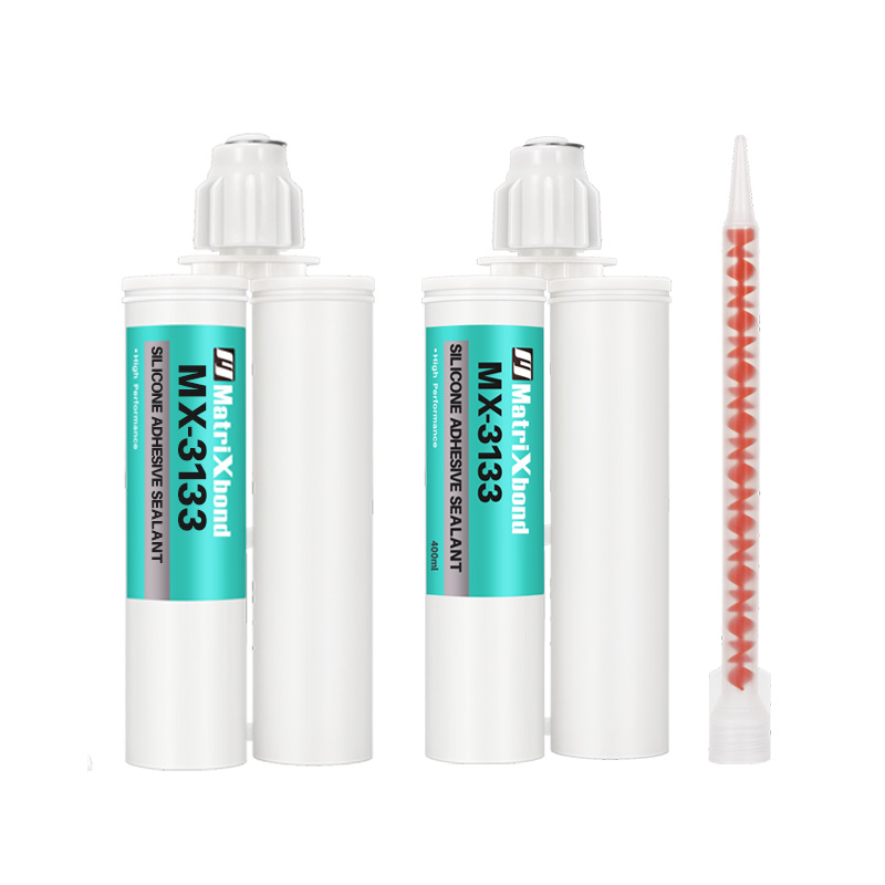 MX-3133 中性室温固化,低气味,双组分1:1混合快速固化硅橡胶接 着剂,对塑料、金属材料等无腐蚀性,易于挤出,粘稠膏状。无需底漆, 即可附着玻璃、金属、陶瓷及大部分工程应用塑料。